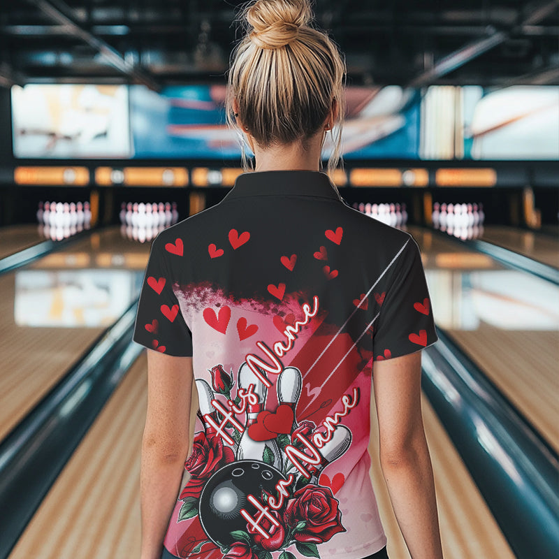 Custom Black And Red Heart Theme Valentine Bowling Polo Shirts For Women, Couple Bowling Shirt IPHW8353