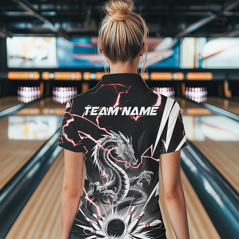 Custom Black And Red Thunder Lightning Dragon Bowling Team Polo Shirts For Women IPHW8556