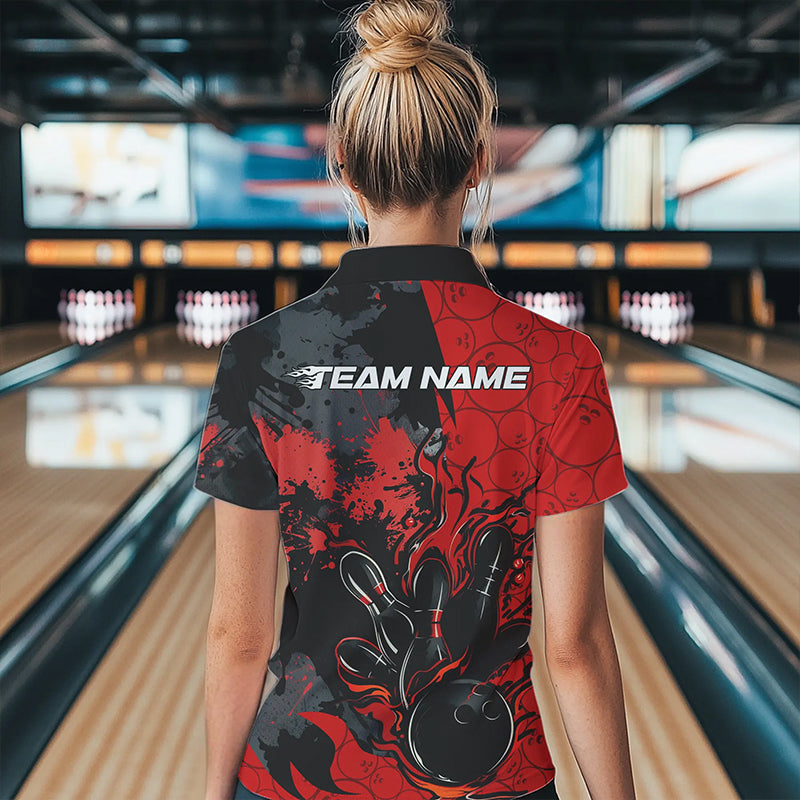 Custom Black And Red Splatter Camo Flame Bowling Polo Shirt For Women, Bowling Team Uniform IPHW8625
