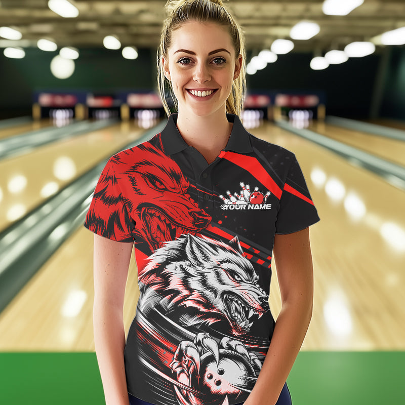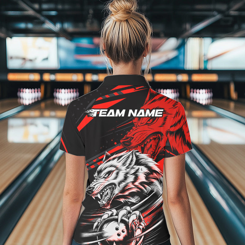 Custom Black And Red Wolf Bowling Women Polo Shirts, Wolf Bowling League Shirt Team Uniform IPHW8714
