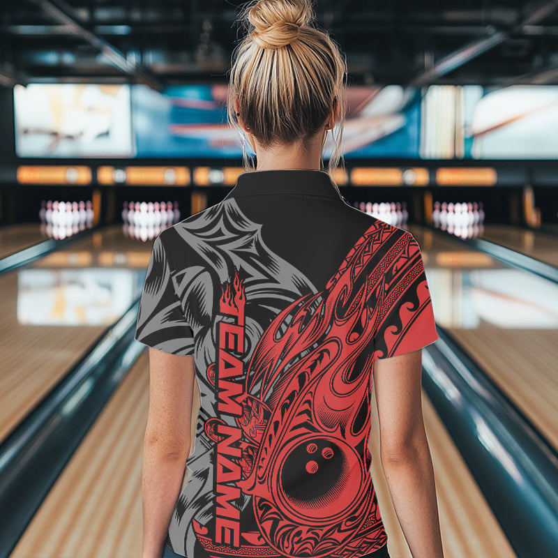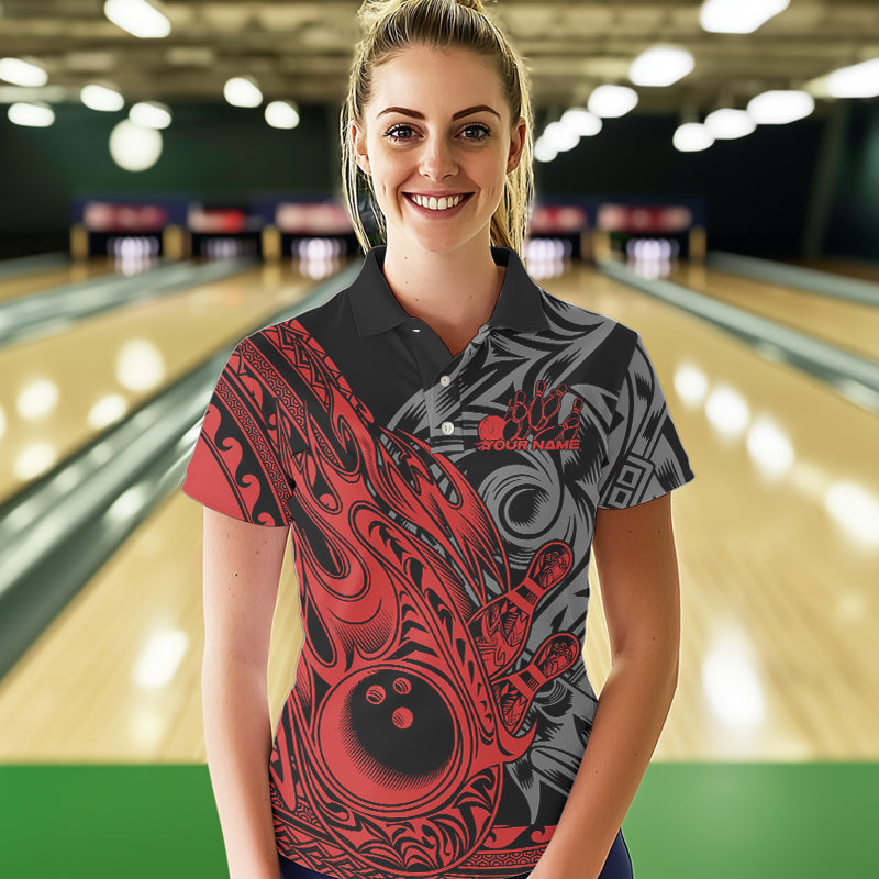 Custom Black And Red Flame Tribal Polynesian Bowling Women Polo Shirt, Bowling Team Uniform IPHW8807