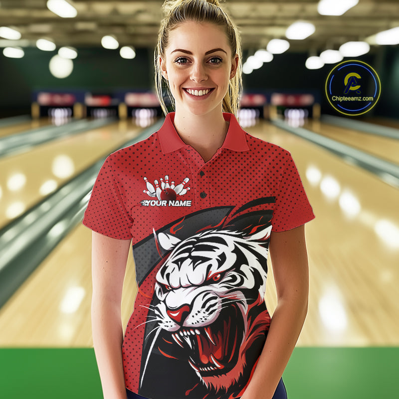 Custom Black And Red Tiger Bowling Team Polo Shirts For Women, Bowling League Shirt IPHW9019