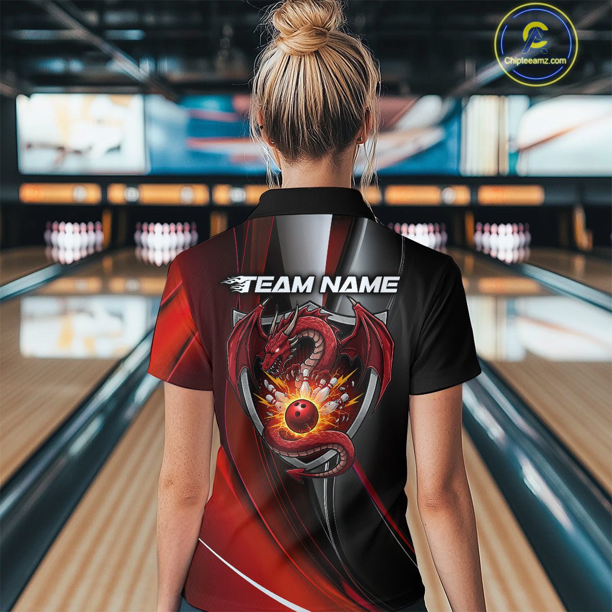 Custom Black And Red Dragon Bowling Polo Shirts For Women, Dragon Bowling Jersey IPHW9342