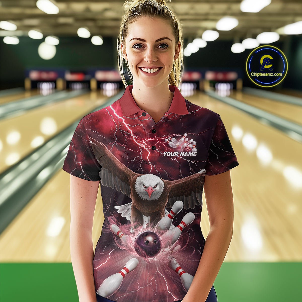 Custom Red Thunder Lightning Eagle Bowling Polo Shirts For Women, Eagle Bowling Jerseys IPHW9366