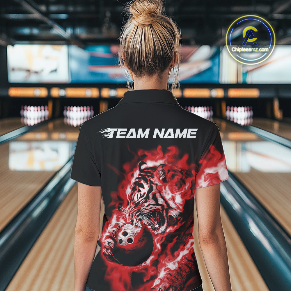 Custom Red Fire Flame Tiger Bowling Jerseys, Bowling Team Women Polo Shirts IPHW9488