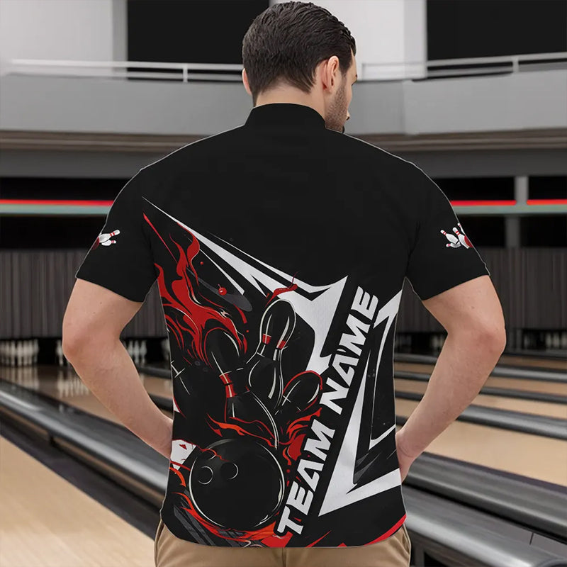 Custom Black And Red Flame Strike Bowling Quarter-Zip Shirts For Men, Strike Bowling Jerseys IPHW8312