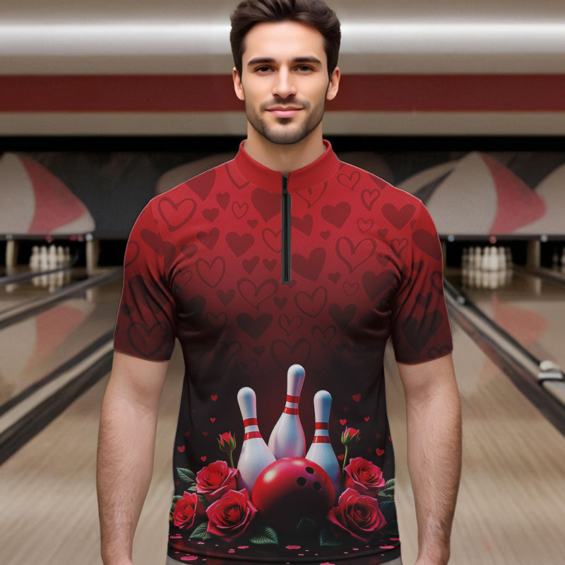 Red Heart Theme Custom Valentines Bowling Quarter-Zip Shirt For Men, Couple Bowling Outfits IPHW8357