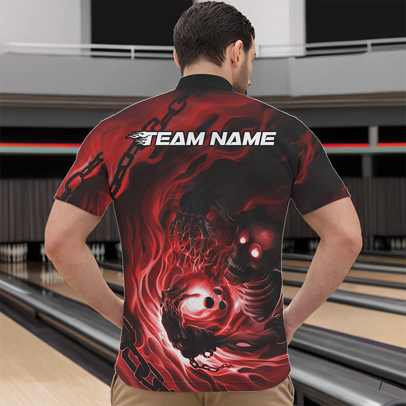 Custom Black And Red Flame Skeleton Bowling Quarter-Zip Shirts For Men, Skull Bowling Team Shirt IPHW8471