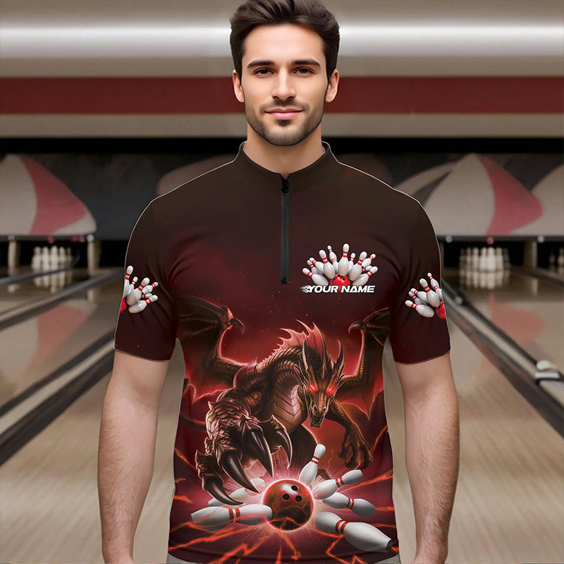 Custom Black And Red Dragon Bowling Team Quarter-Zip Shirts For Men, Dragon Bowling League Shirt IPHW8549