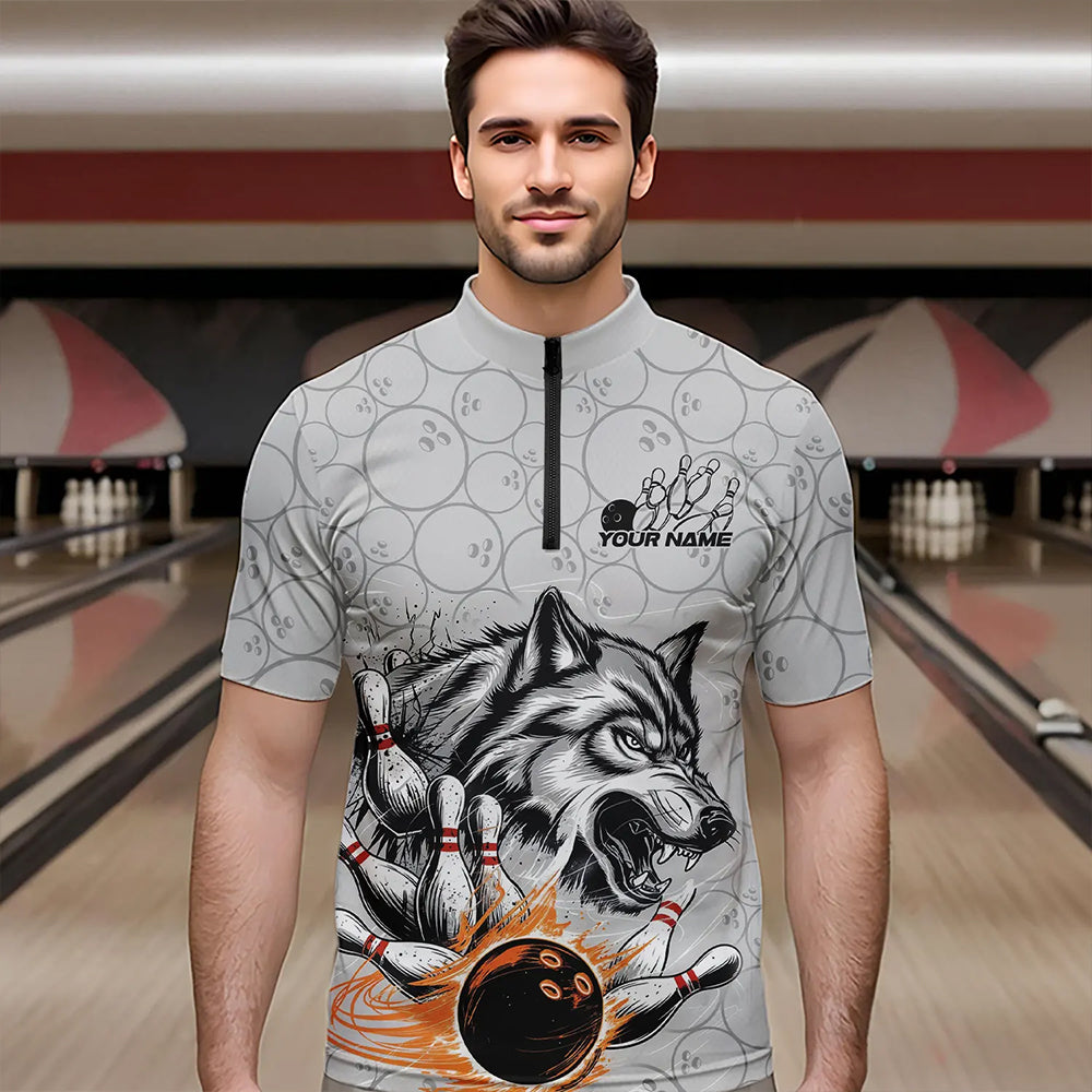 Custom Gray And Red Wolf Bowling Quarter-Zip Shirts For Men, Wolf Bowling Tournament Shirt IPHW8717