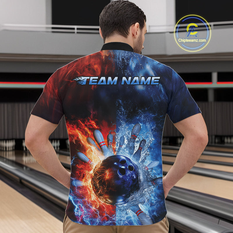Custom Red Fire Blue Water Explosion Bowling Team Quarter-Zip Shirts For Men, Bowling Uniform IPHW9448