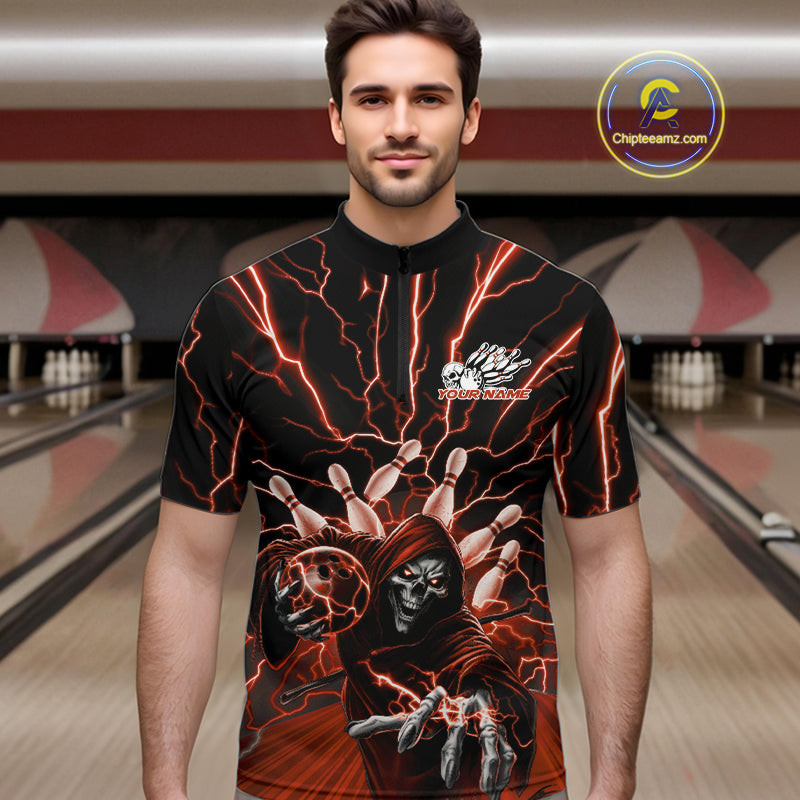Custom Black And Red Lightning Grim Reaper Bowling Men Quarter-Zip Shirt, Halloween Outfit IPHW9806