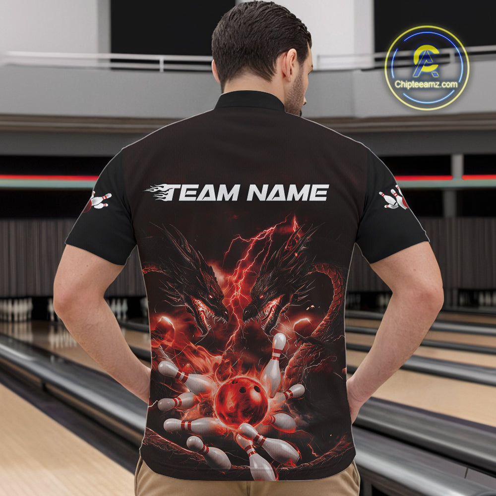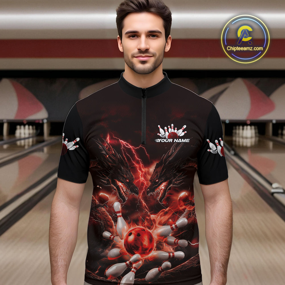 Custom Red Lightning Flame Dragons Bowling Men Quarter-Zip Shirt, Fire Dragon Bowling Jerseys IPHW9816