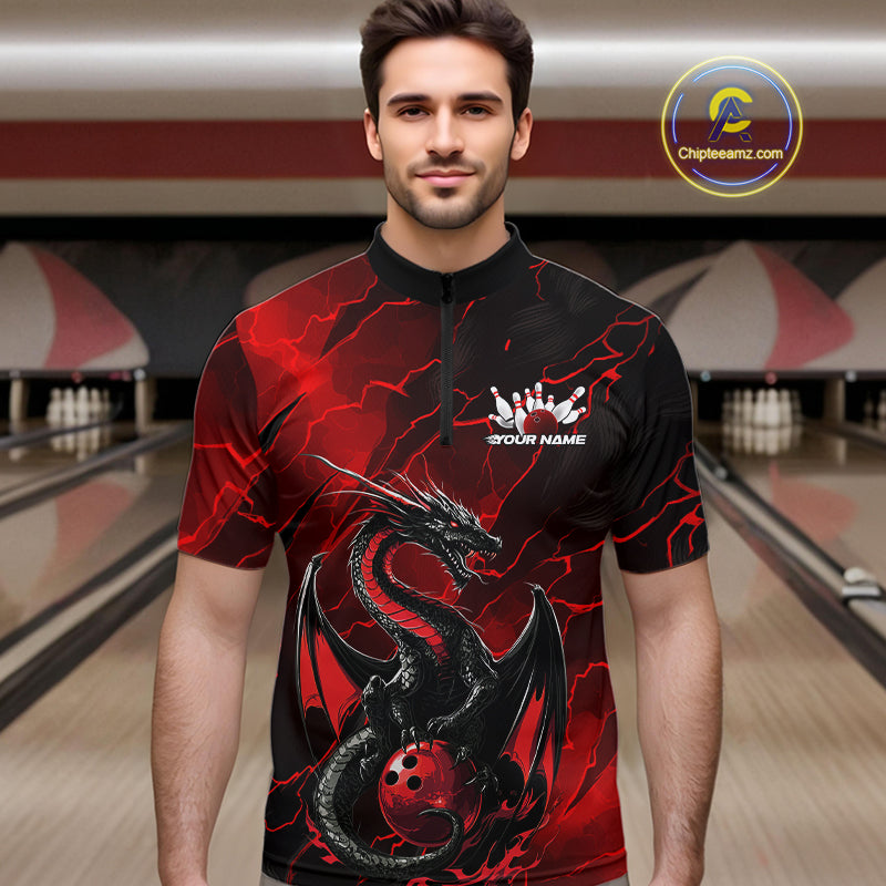 Custom Red Lightning Dragon Bowling Quarter-Zip Shirt For Men, Dragon Bowling Team Jersey IPHW9901