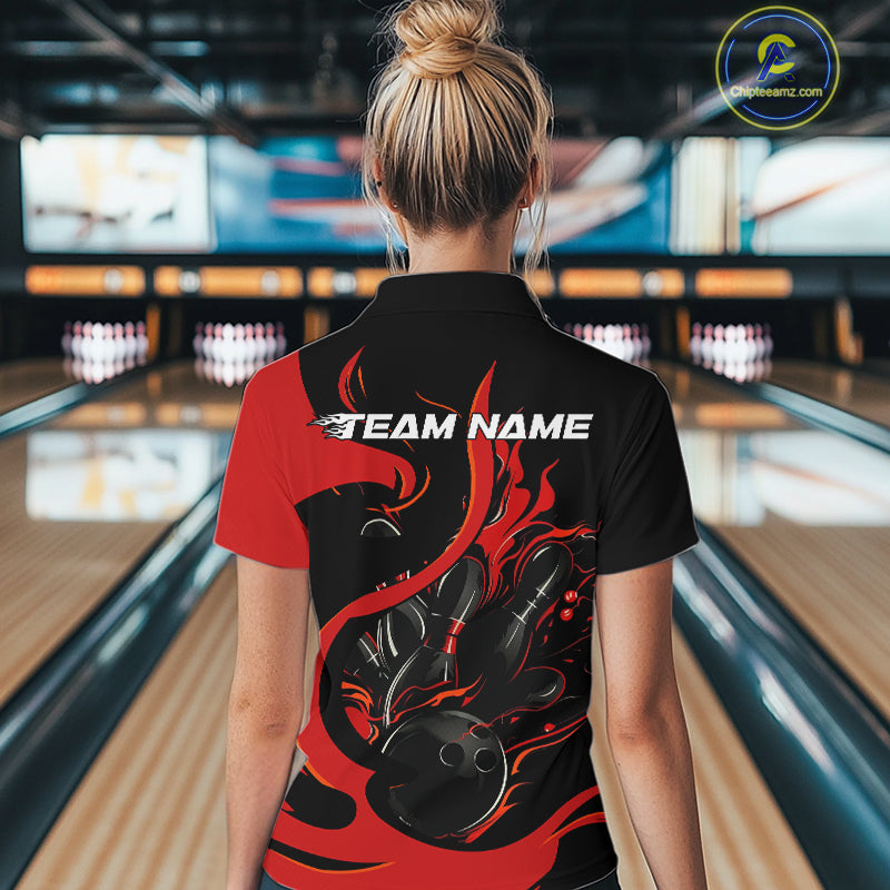 Custom Black And Red Flame Bowling Women Quarter-Zip Shirt, Bowling Team Uniform IPHW9245