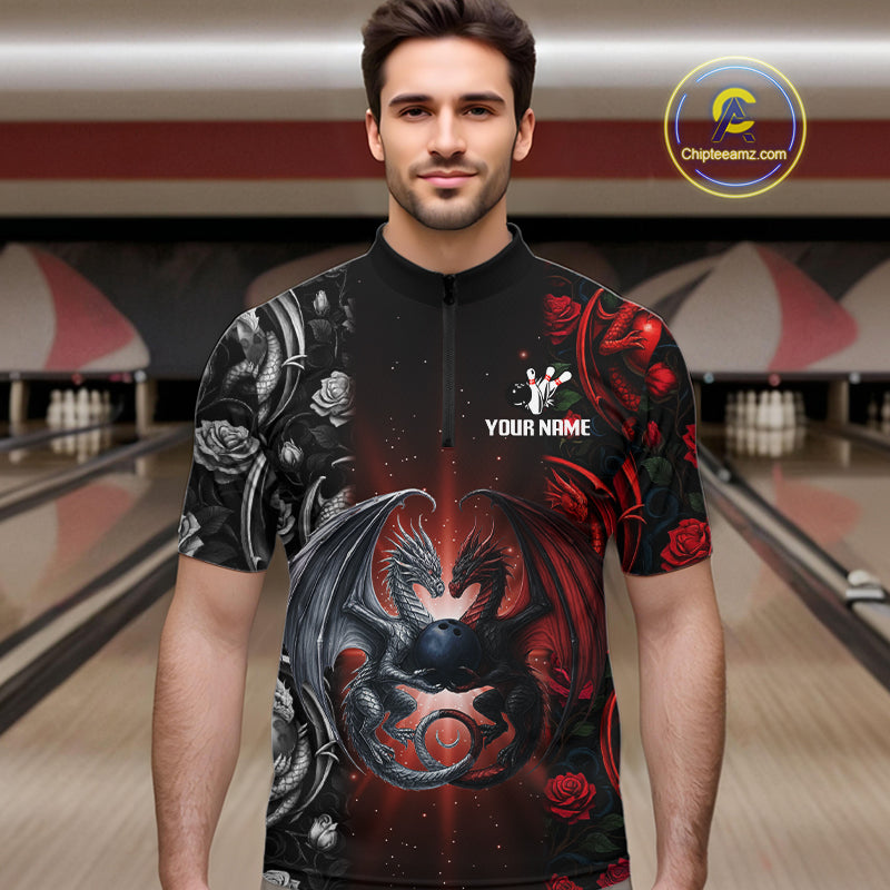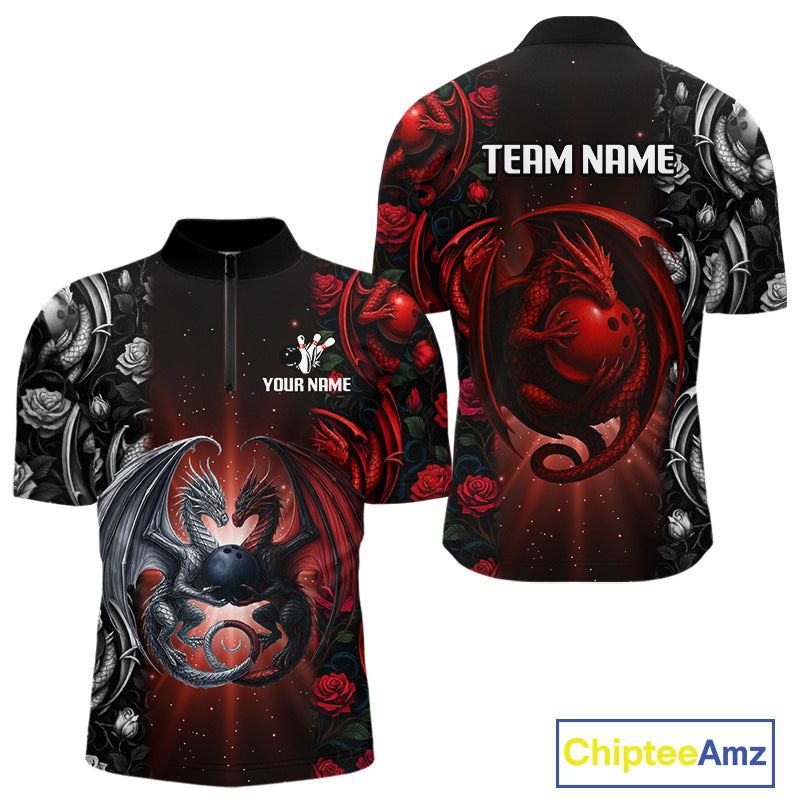 Red Dragon Roses Pattern Custom Bowling Polo, Quarter Zip shirts For Men, Dragon Bowling League Shirt NQS10626