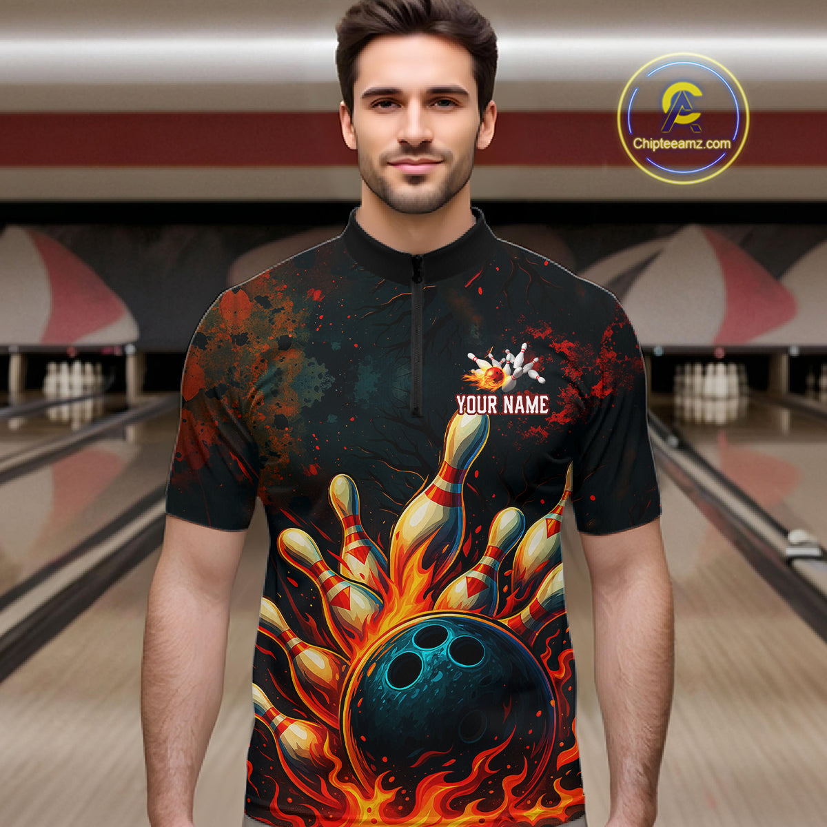 Red Flame Bowling Polo, Quarter Zip Shirts for Men Custom Team Bowling Outfit, Gift for Bowlers NQS10752