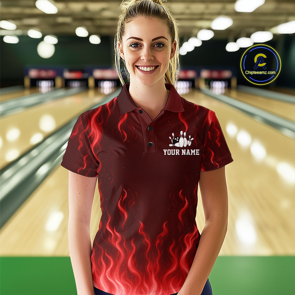 Red flame lightning thunder Bowling polo, quarter zip shirts for Women custom Bowling team jerseys NQS10979