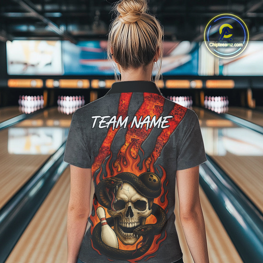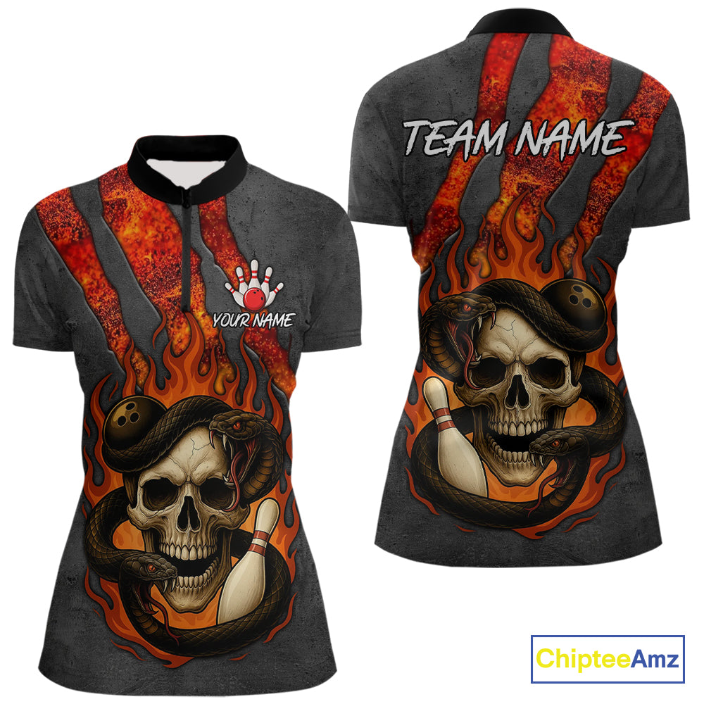 Red Flame Skull Snake Bowling Polo, Quarter Zip Shirts for Women Custom Team Bowling Jersey NQS10937