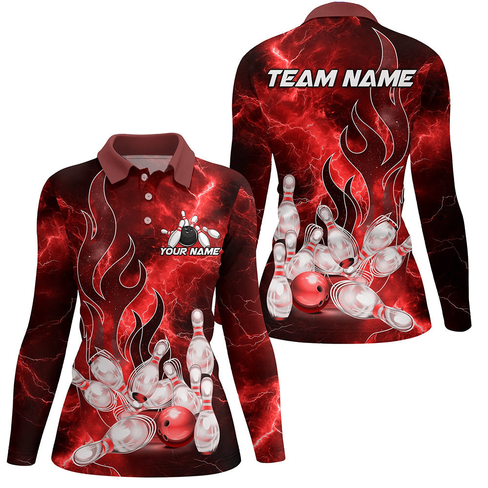 Red Lightning Thunder Bowling Polo, Quarter Zip Shirt For Women Red Flame Custom Team Bowler Jersey NQS9103