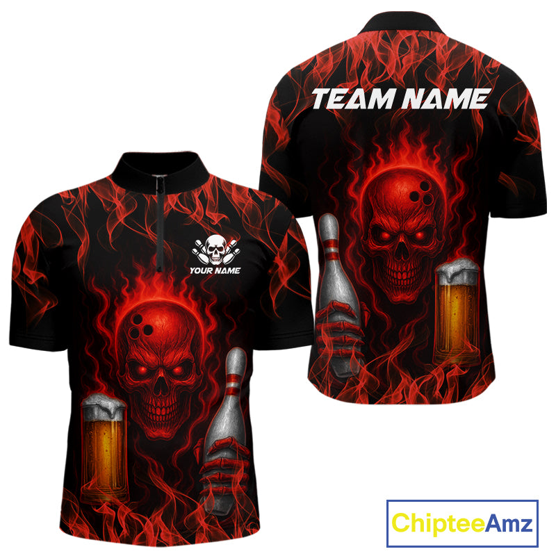 Red Skull and Beer Bowling shirts with flames Custom Bowling Polo, 1/4 Zip bowling outfits for men NQS10955