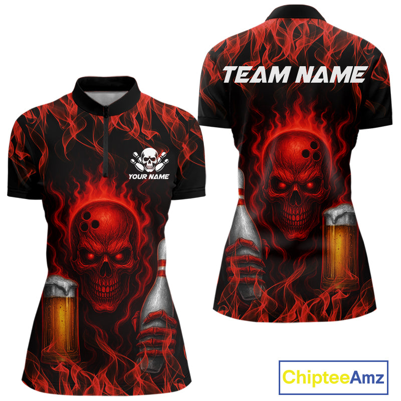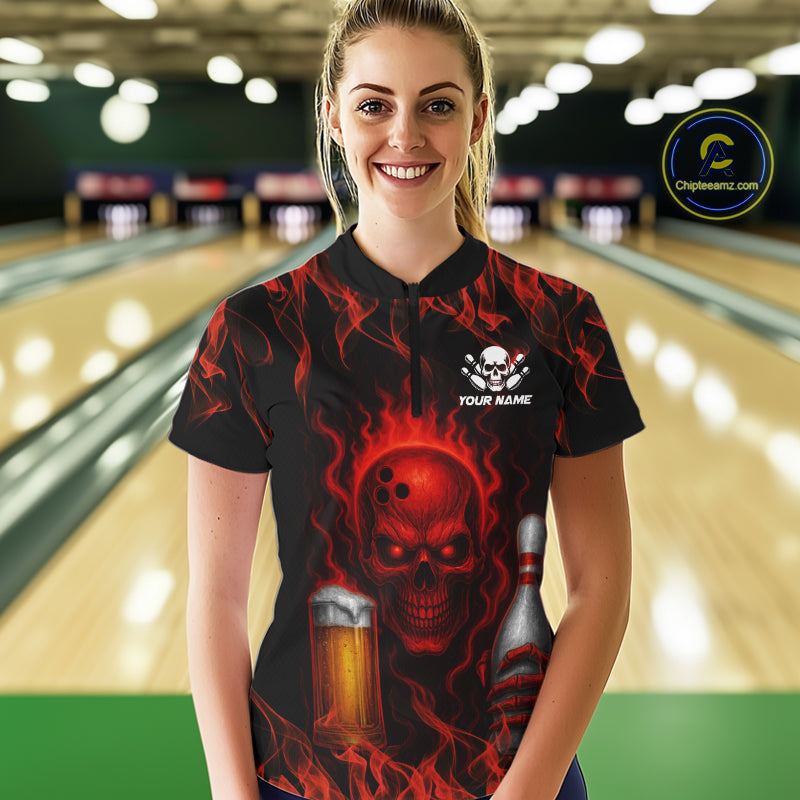 Red Skull and Beer Bowling shirts with flames Custom Bowling Polo, 1/4 Zip bowling outfits for Women NQS10955
