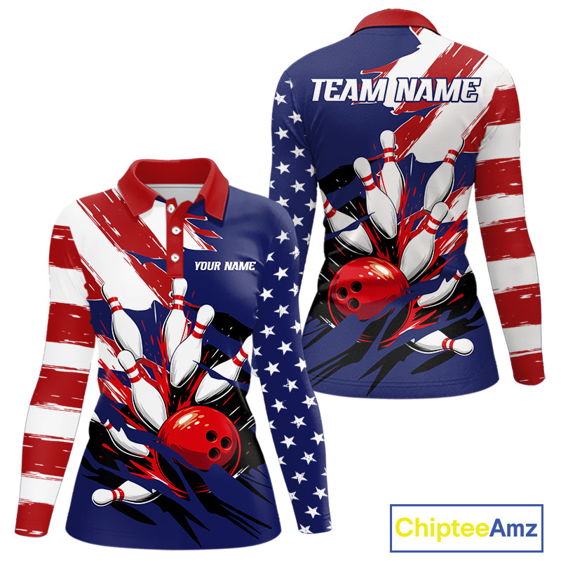 Red, White and Blue American flag Bowling Shirts for Women Custom Patriotic Bowling Team Outfit NQS10431