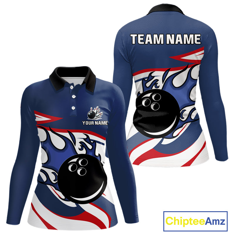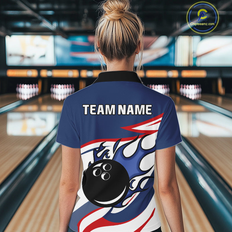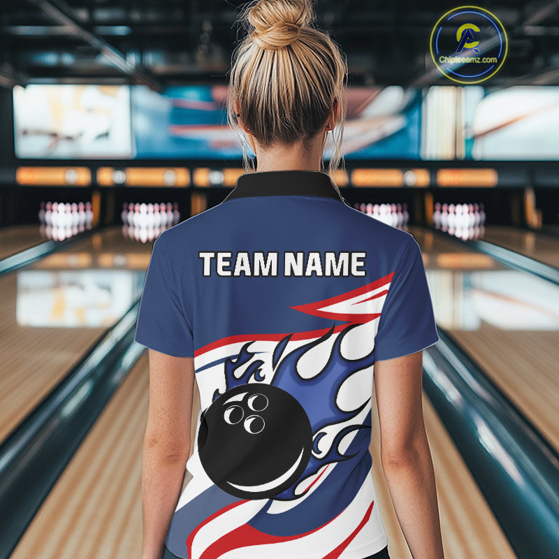 Red, White and Blue Flame bowling ball polo, 1/4 zip shirts for Women Custom patriotic Bowling Outfit NQS10045