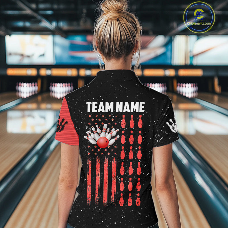 Custom Red Grunge American Flag Bowling Shirt For Women, Patriotic Bowling Team Jersey Polo, 1/4 Zip TDM4633