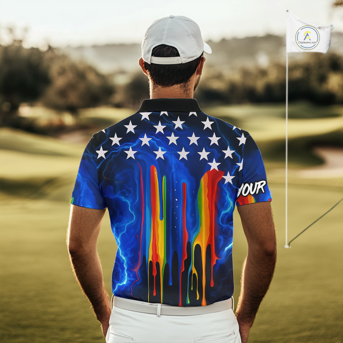 Blue lightning thunder rainbow American Flag Men golf polo shirts Custom patriotic mens golf outfit NQS10154
