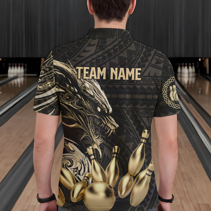 Black and Gold Dragon Tribal Bowling Polo, 1/4 Zip Shirts For Men Custom Retro Bowling Team Jerseys NQS9591