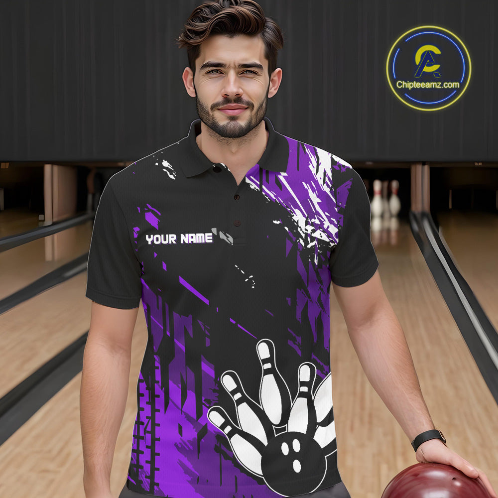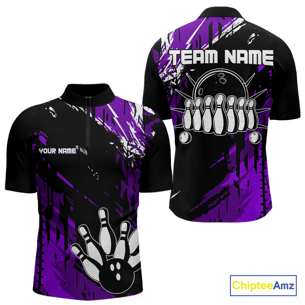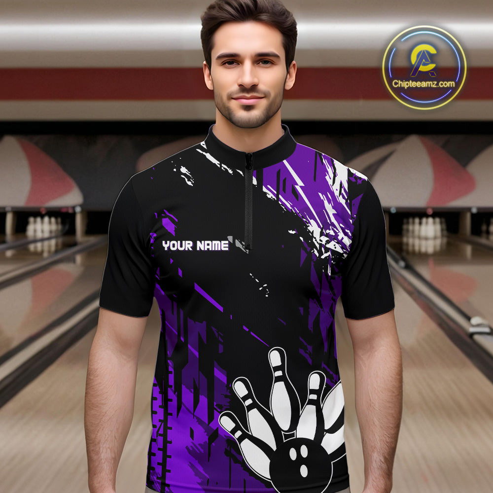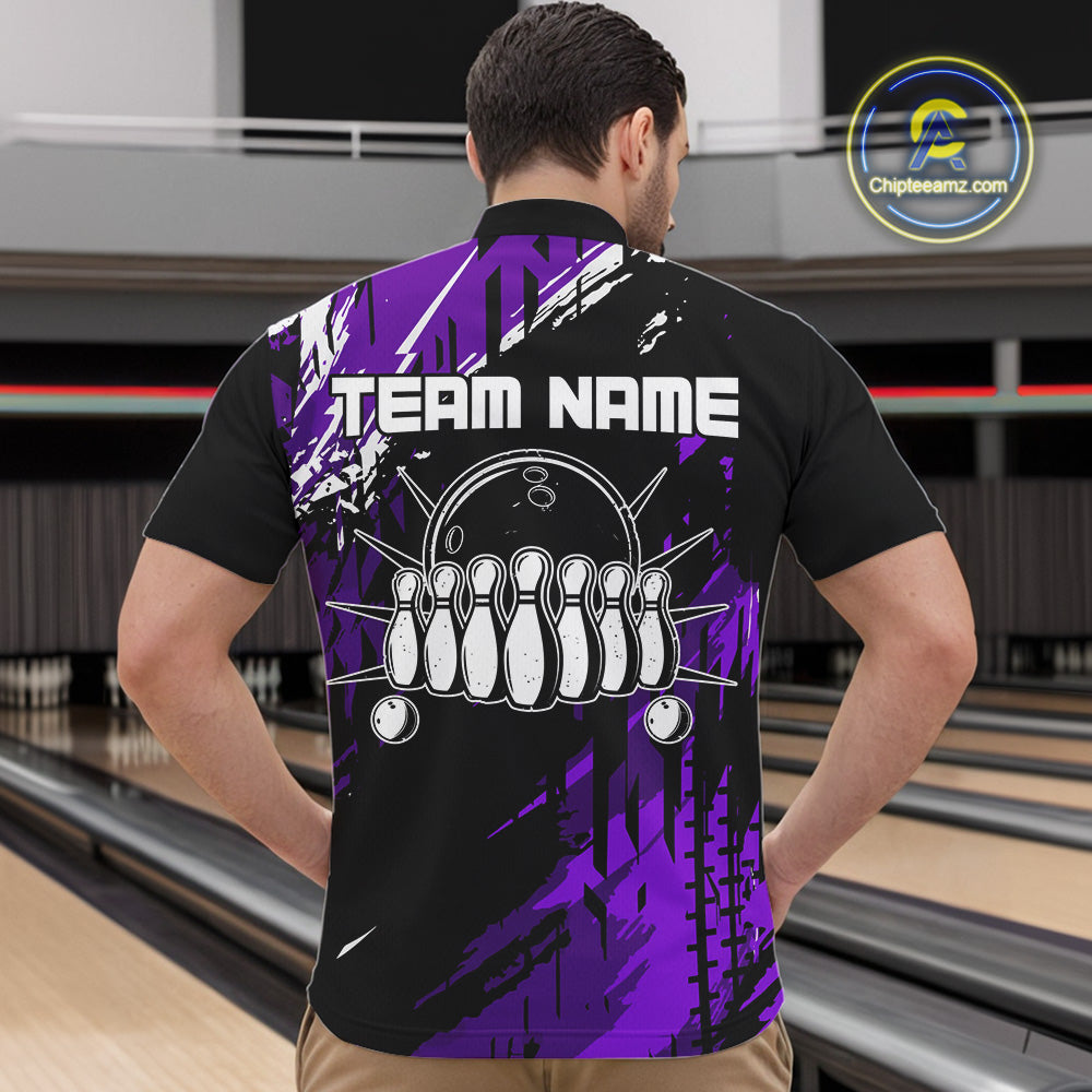 Black and Purple Mens bowling shirts Custom retro bowling ball and pins bowling team league jerseys NQS10642