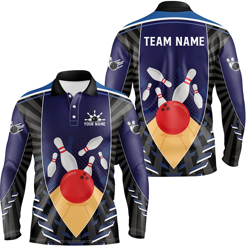 Blue Bowling Polo, Quarter Zip shirts for men custom retro bowling ball and pins team bowling jerseys NQS7796