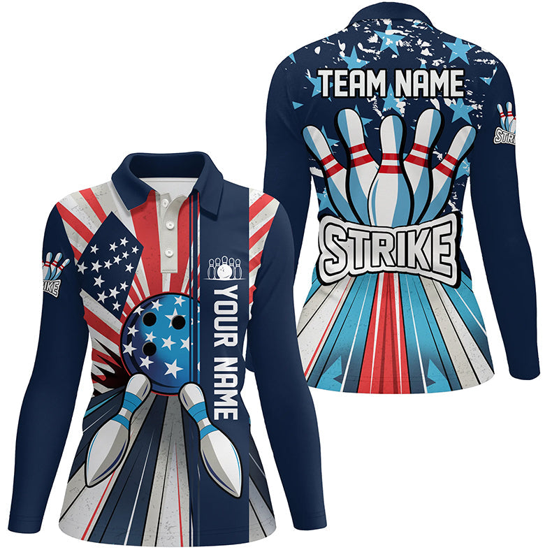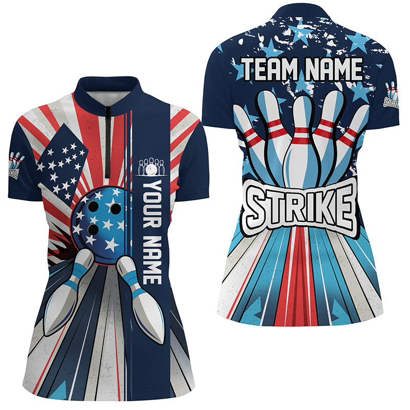 Personalized American Flag Retro bowling Women Polo, Quarter Zip shirts, Patriotic Bowling Team Jersey NQS7730