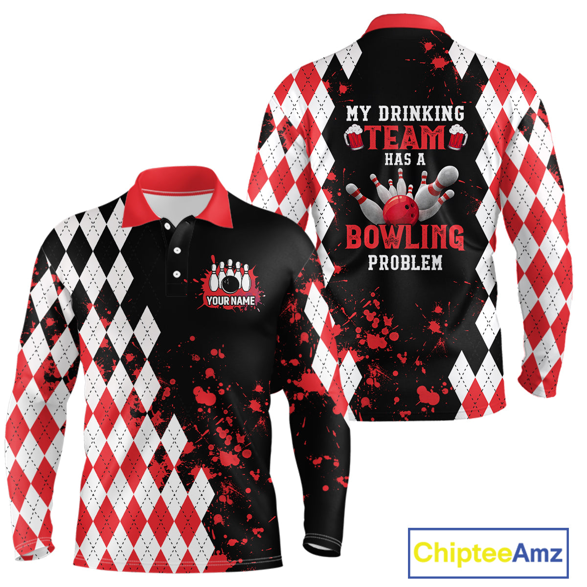 Red argyle pattern Retro Bowling Shirts For Men Custom My drinking team has a bowling problem NQS9825