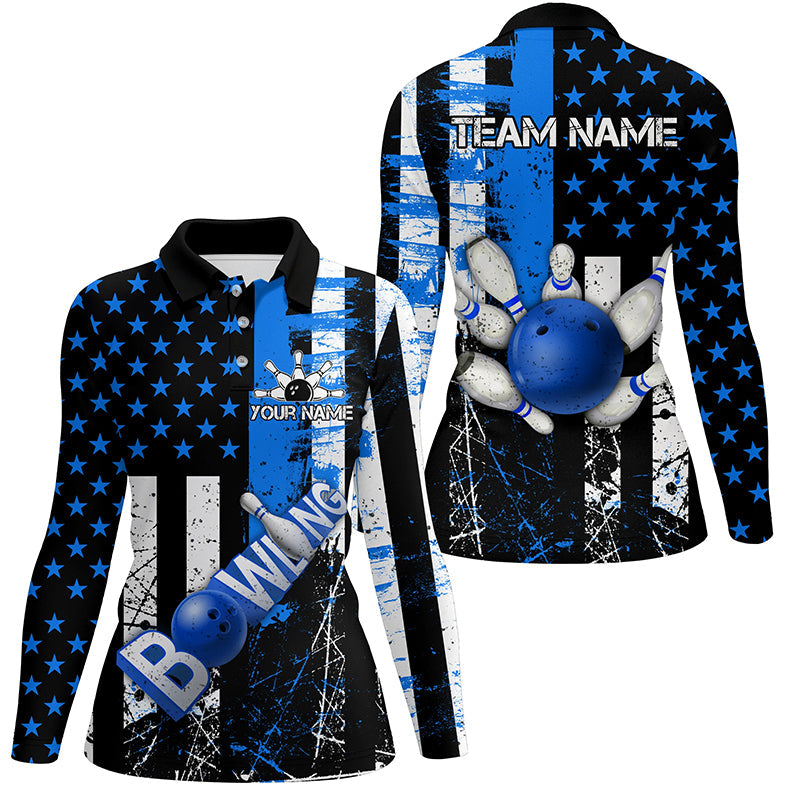 Retro American flag Women bowling polo shirts Custom bowling Team Jerseys, gifts for bowlers | Blue NQS7340