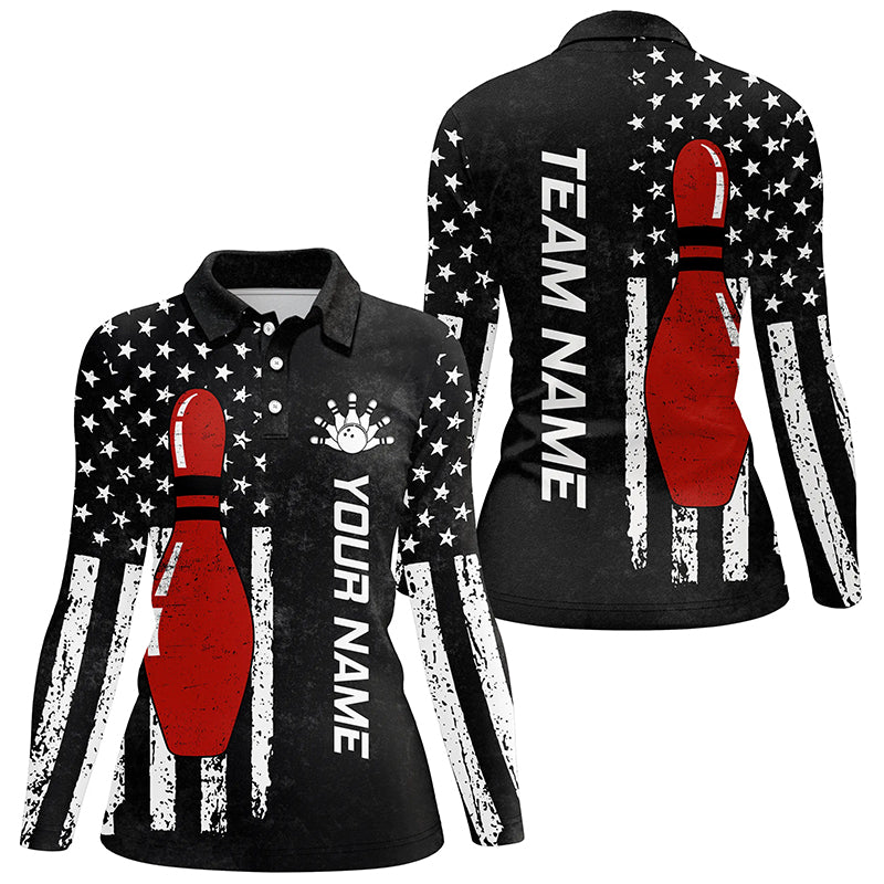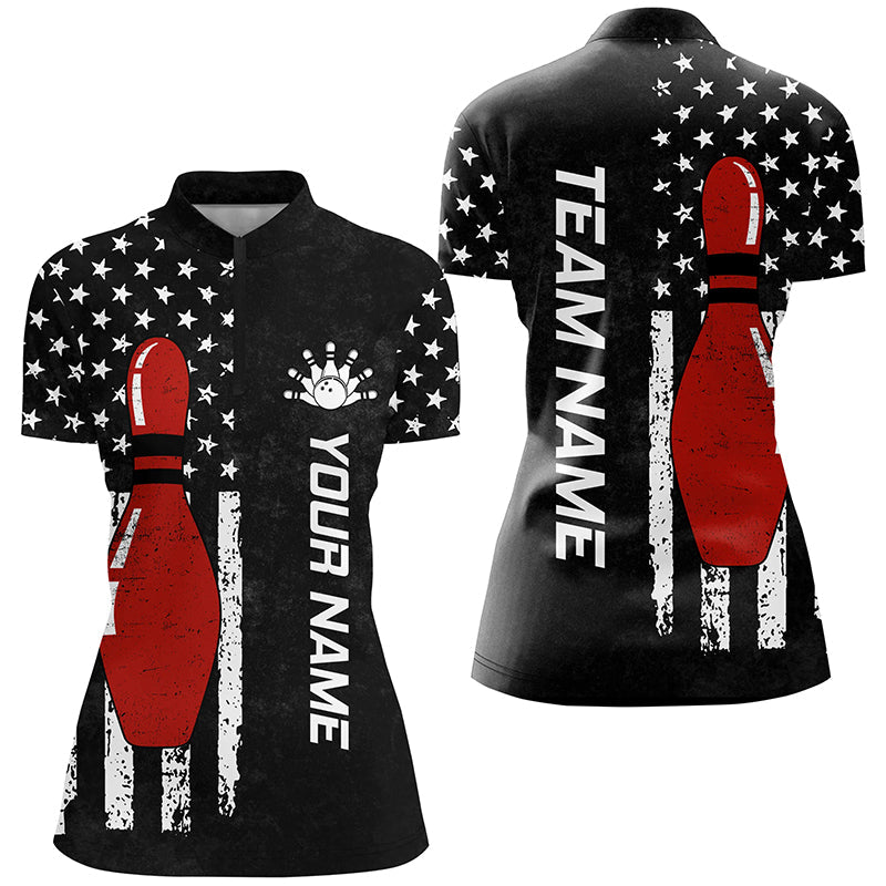 Retro Black American Flag Women Bowling Polo, Quarter zip Shirts Custom Patriotic Bowling Team Jerseys NQS8414
