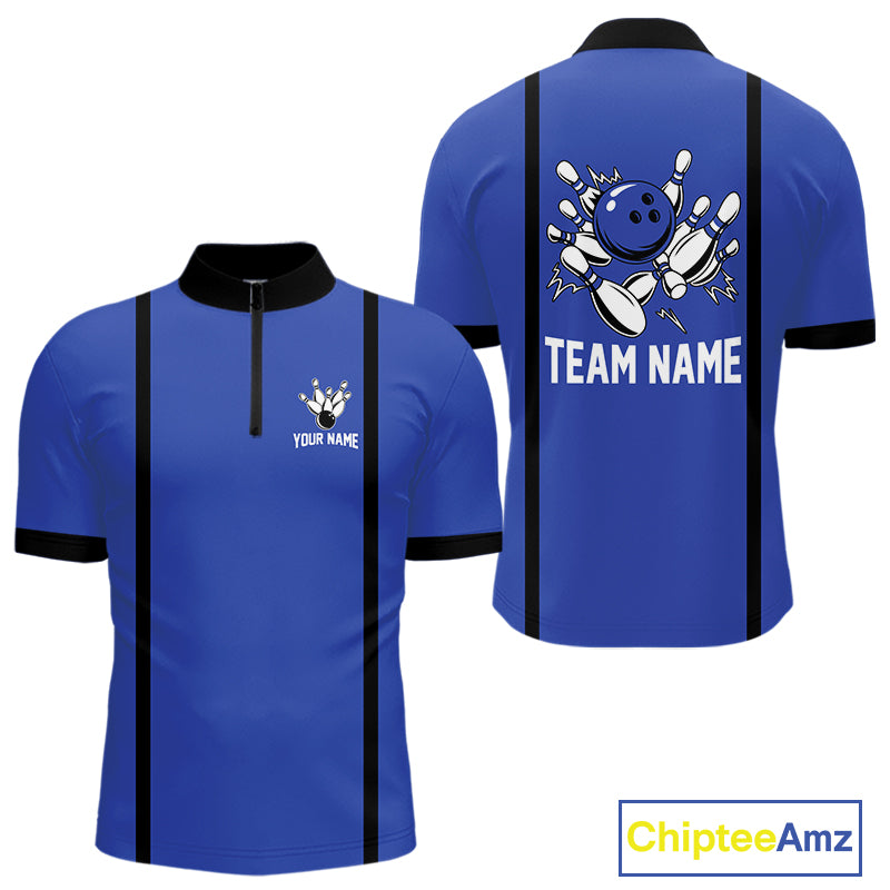 Retro Bowling Polo, Quarter Zip shirts For Men custom bowling team shirts Bowler Outfits | Blue NQS10546
