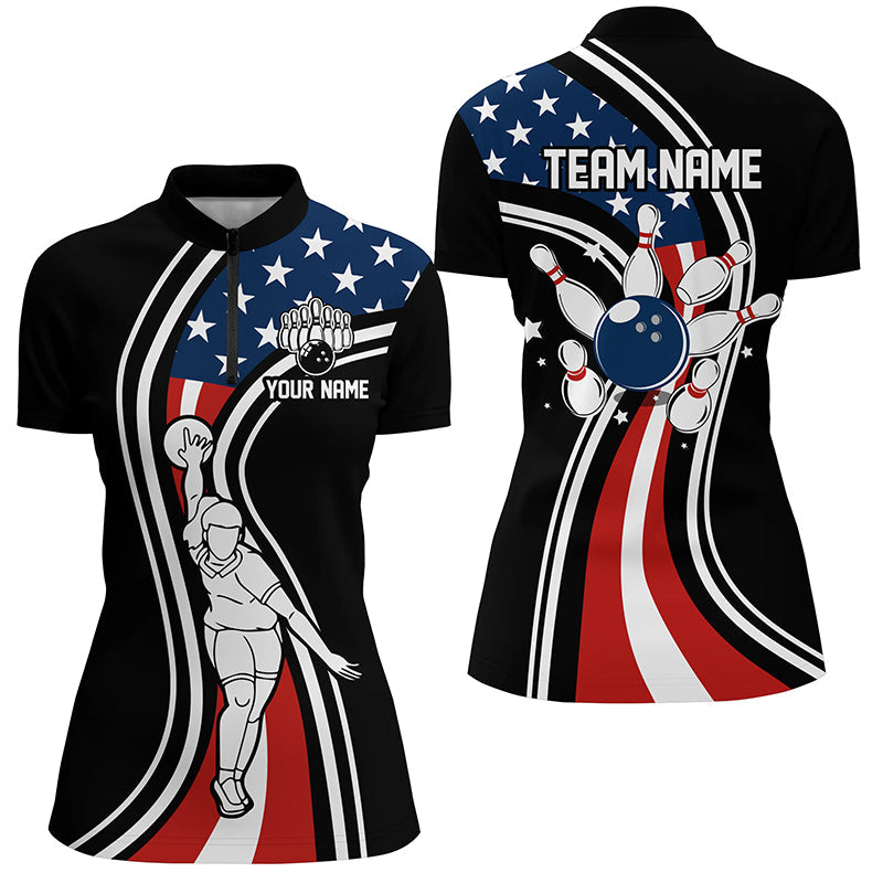 Retro bowling Polo, Quarter Zip shirts for Women Custom American flag patriotic team bowling jerseys NQS7895