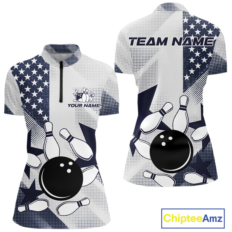 White and Blue American Flag Bowling shirts for Women Custom patriotic retro Bowling Team Jersey NQS10248