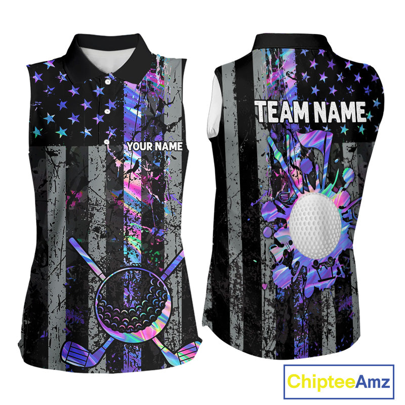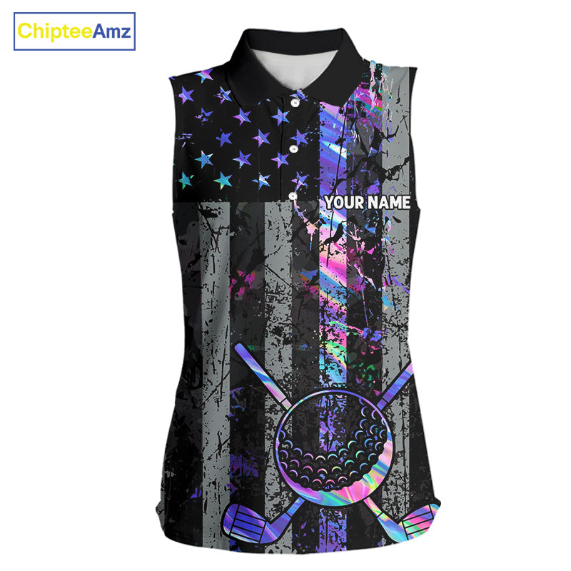 Black American Flag Hologram Women sleeveless polo shirt Custom patriotic ladies golf tops NQS11640