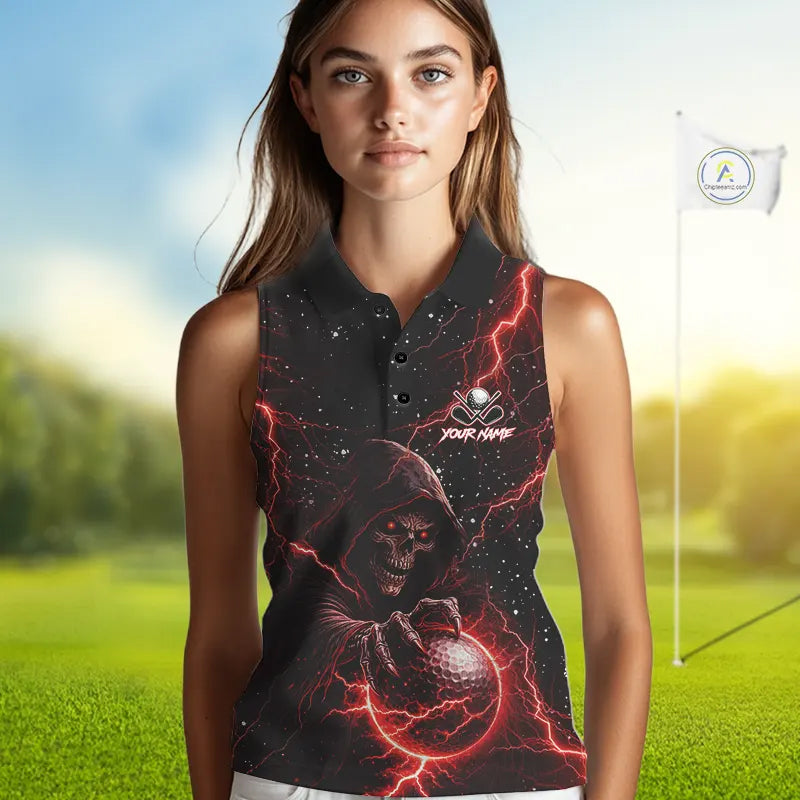 Custom Black And Red Lightning Thunder Skull Reaper Womens Sleeveless Golf Shirt, ladies golf apparel NQS11624