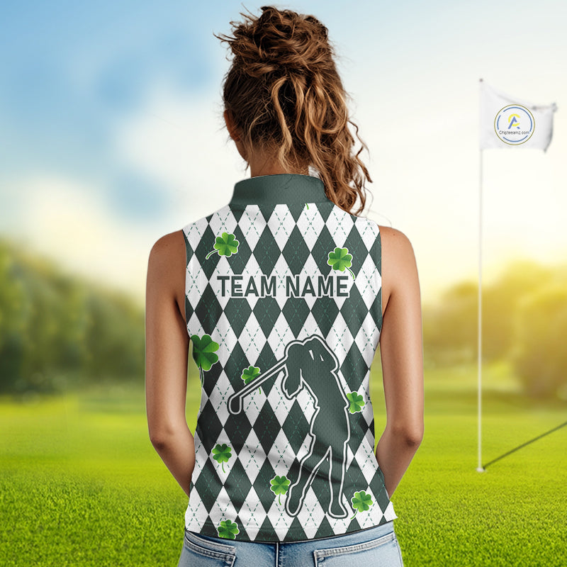 Green argyle pattern lucky shamrock Sleeveless Polo Shirt Custom St. Patrick's ladies golf outfit NQS10775