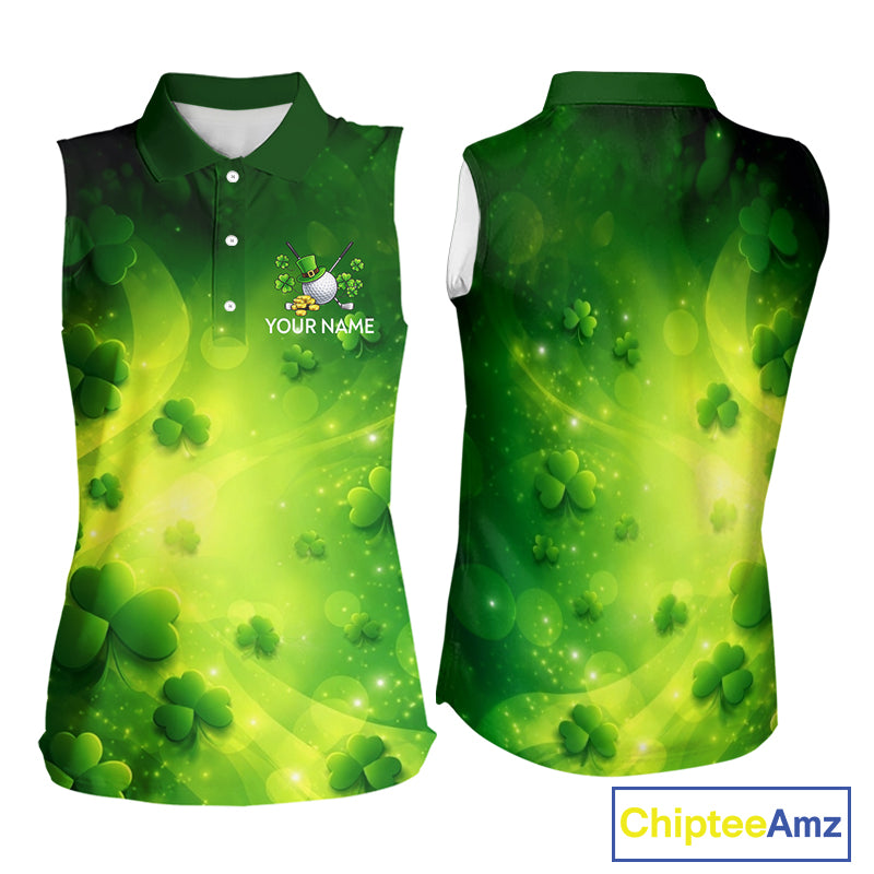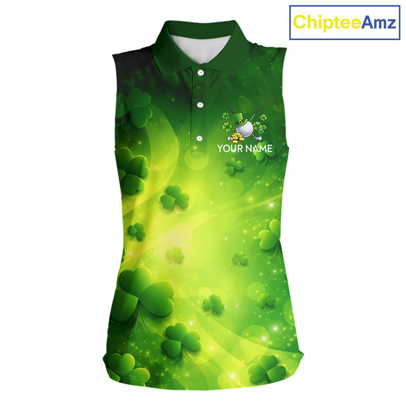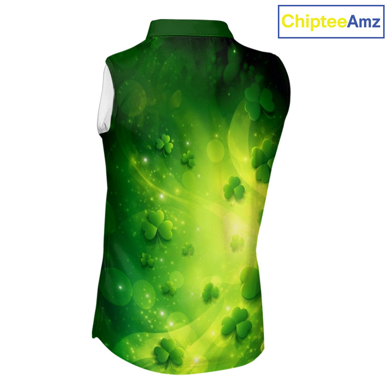 Green clover pattern St Patrick's Day Ladies Sleeveless Golf Polo Shirts Custom Shamrock Golf outfit NQS11628