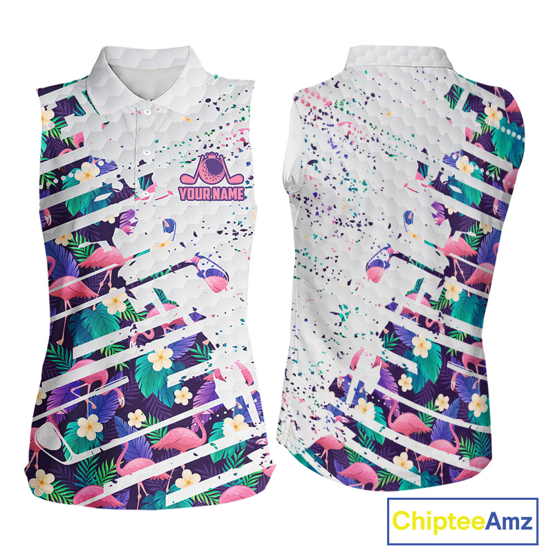 Women Sleeveless Flamingo Golf Polo Shirt, Colorful Floral Flamingo Patter, Tropical Golf Shirt NBT477
