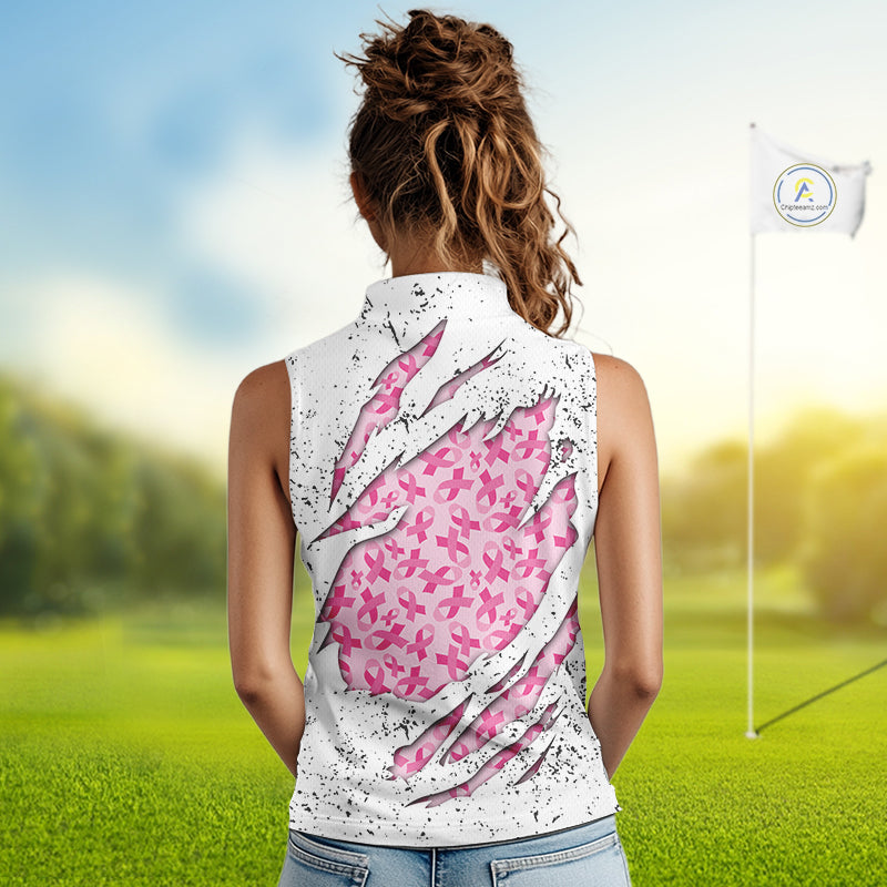 Pink ribbon white grunge pattern Women Sleeveless Polo Shirt custom breast cancer awareness golf top NQS10386