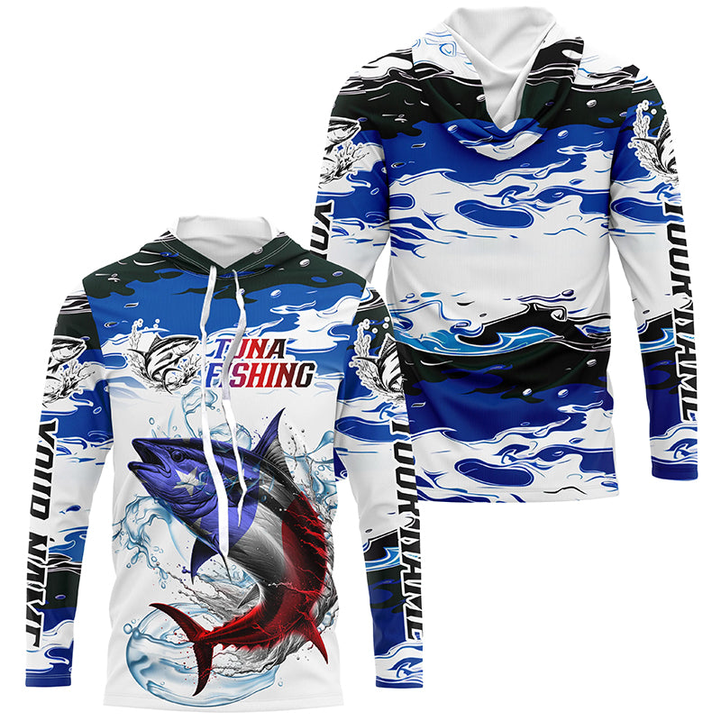 Custom Patriotic Tuna Fishing Camo Jerseys, American Flag Tuna Long Sleeve Saltwater Fishing Shirts IPHW6052