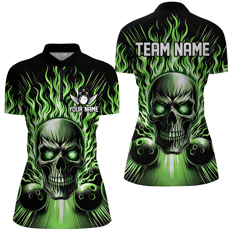 Personalized Skull Bowling Shirt For Women Custom Team'S Name Flame Bowler Jerseys | Green IPHW5819