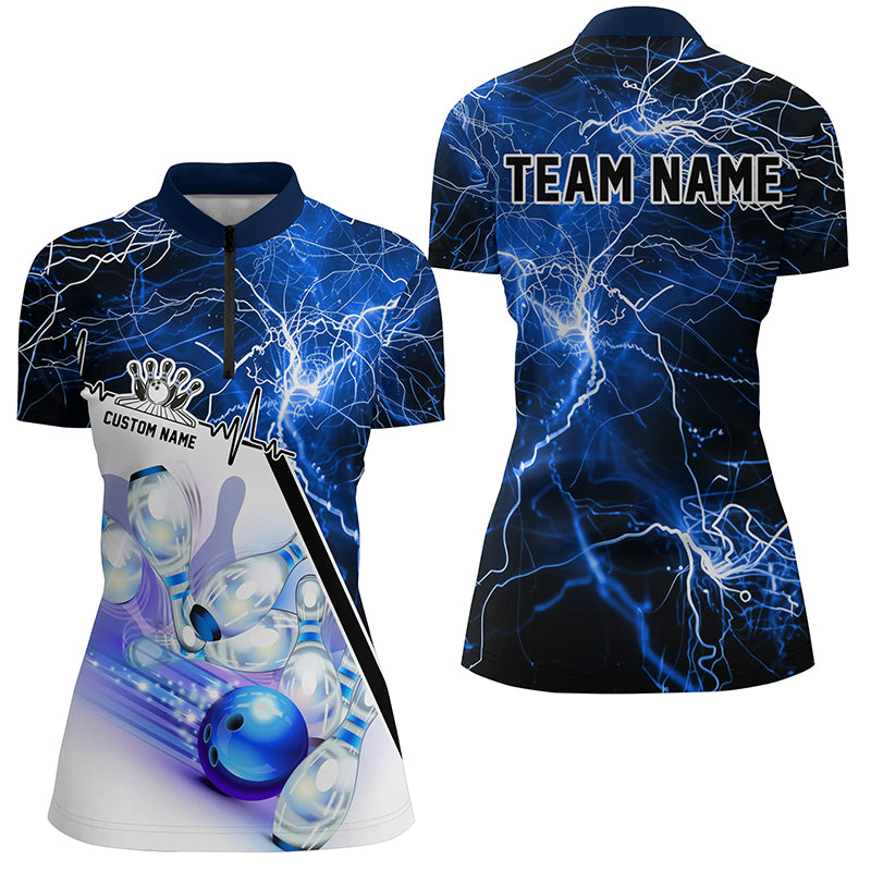 Strike Bowling On The Lane Custom Blue Thunder Lightning Ladies Bowling Team Shirts IPHW6264