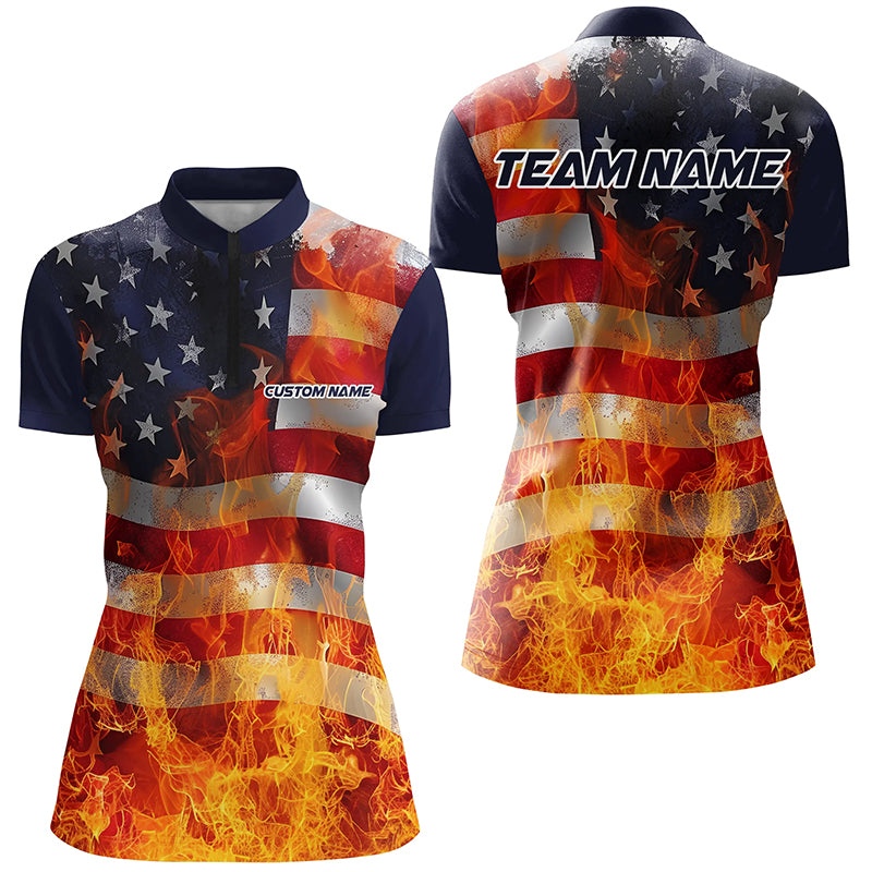 American Flag Flame Custom ladies Bowling Team Shirts, Patriotic Bowling Team Jerseys IPHW6435